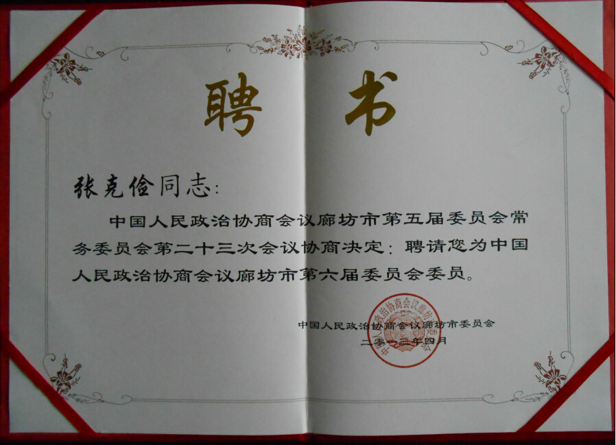 張克儉被聘為廊坊政協(xié)委員 廊坊市工商聯(lián)會員單位