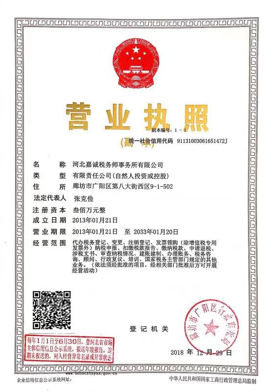 河北嘉誠稅務師事務所執(zhí)業(yè)證書 -