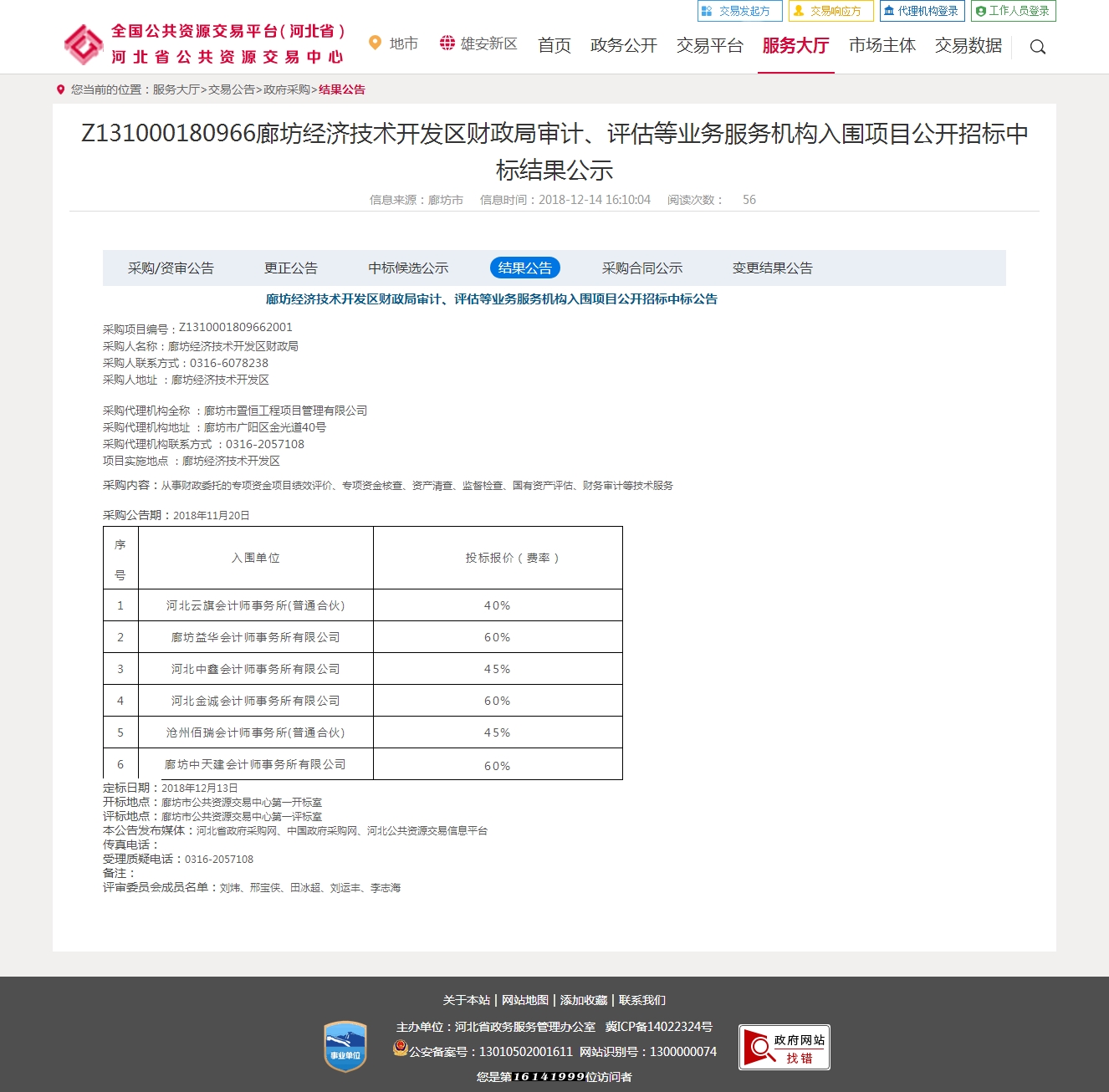 廊坊經(jīng)濟(jì)技術(shù)開發(fā)區(qū)財(cái)政局審計(jì)、評(píng)估等業(yè)務(wù)服務(wù)機(jī)構(gòu)中標(biāo)公示