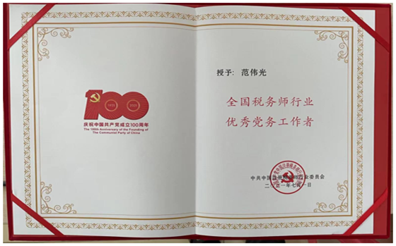 高莉書記首先為廊坊市稅務(wù)師行業(yè)黨支部書記、河北嘉誠稅務(wù)師事務(wù)所經(jīng)理范偉光同志頒發(fā)“全國稅務(wù)師行業(yè)優(yōu)秀黨務(wù)工作者”榮譽(yù)證書。