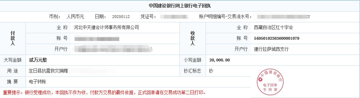 一方有難,八方支援。災(zāi)情發(fā)生后,省人大代表、經(jīng)理范偉光第一時(shí)間號(hào)召全體員工向地震災(zāi)區(qū)捐款捐物。2025年1月12日,飽含中天建財(cái)經(jīng)服務(wù)管理機(jī)構(gòu)全體員工心意的兩萬余元款項(xiàng)匯至西藏自治區(qū)紅十字會(huì)。總經(jīng)理張克儉表示,我們雖然不能親自到達(dá)災(zāi)區(qū)提供幫助,但也想盡一點(diǎn)自己的責(zé)任,希望災(zāi)區(qū)人民盡快恢復(fù)正常生產(chǎn)生活。