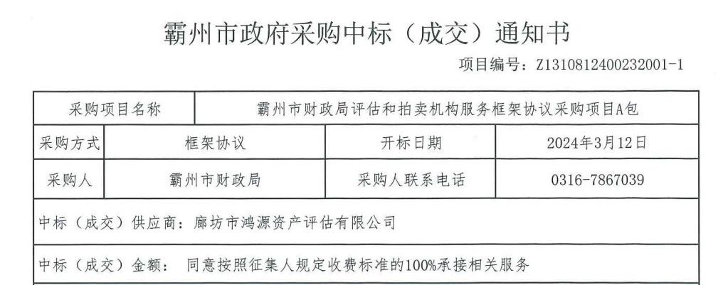 2024年3月13日,廊坊市鴻源資產(chǎn)評估有限公司在霸州市財政局評估和拍賣機構(gòu)服務框架協(xié)議采購項目競標中,憑借過硬的資質(zhì),良好的信譽、雄厚的技術(shù)實力,加之優(yōu)秀的投標方案與合理報價,扎實高效的工作作風和良好的企業(yè)信譽,貼心周到的服務,精準快速的響應,匠心獨具的創(chuàng)意,以及豐富的開發(fā)經(jīng)驗,經(jīng)過層層評審憑借誠懇認真的態(tài)度,最終以絕對的優(yōu)勢中標。